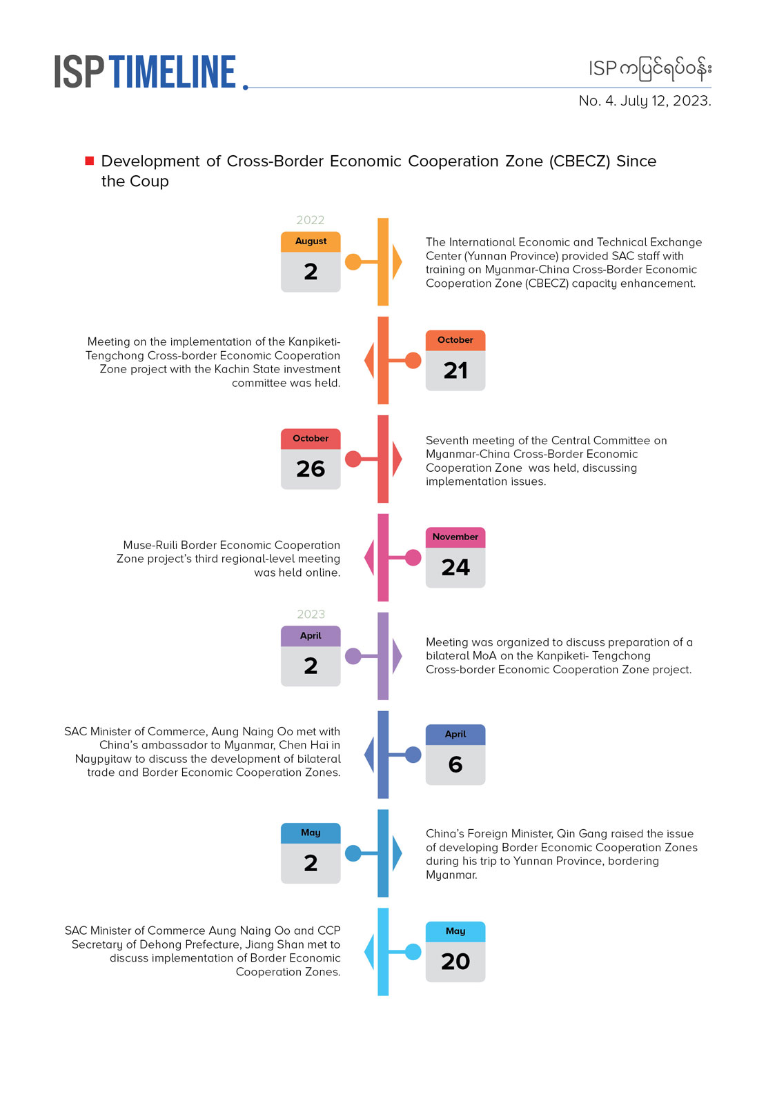 This ISP Explainer No. 4 centers on recent developments in China-Myanmar relations based on ISP-Myanmar’s timelines of notable events. One major event of concern is that of a convoy of Chinese officials who were shot while traveling along the Sadon-Kanpiketi Highway at a time when State Administration Council (SAC) forces had renewed their offensive against the Kachin Independence Army (KIA). During the same period though, we have observed more collaborative meetings between SAC ministers and authorities from China’s Yunnan province in order to advance the Cross-border Economic Cooperation Zone (CBEPZ) under the wider agenda of the China-Myanmar Economic Corridor (CMEC), and the International Land-Sea Trade Corridor (ILSTC). It also appears that China is driving greater security collaboration since President Xi Jinping proposed the Global Security Initiative. This has resulted in greater diplomatic maneuvers in the China-Myanmar bilateral relationship. Conversely, in the economic sphere China has effectively enacted ‘a decoupling strategy’ concerning its interests in Myanmar in the face of the ongoing conflict.