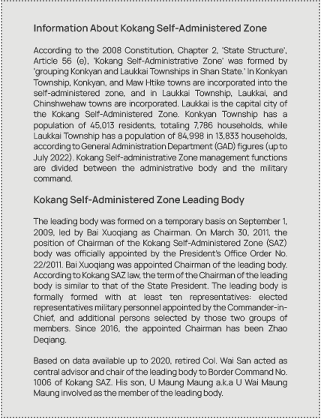For background information on the Kokang Self-Administered Zone (SAZ), covering topics such as Kokang’s inclusion into Myanmar territory, the Peng family, Yang family, Pe family, and the Kokang army in the past, as well as the modern-era MNDAA (Myanmar Democratic Alliance Army), please visit the ISP Gabyin Community.