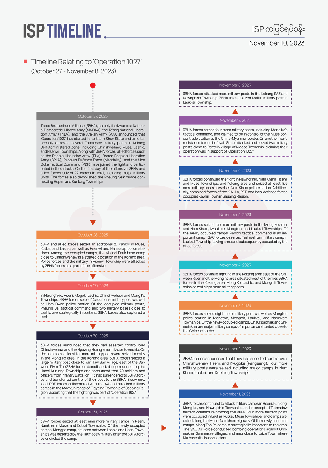 While conflicts as part of the current ‘Operation 1027’ have been raging broadly in at least eleven townships, the main target of the operation remains the re-occupation of Laukkai, while other battles’ objectives are to cut off supplies and reinforcements to the Myanmar military (Please see ISP Mapping No. 22).