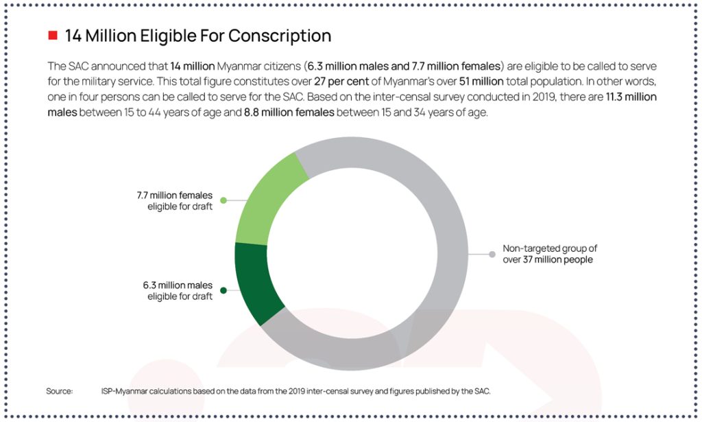 The State Administration Council (SAC) declared the enforcement of “the People’s Military Service Law”*, which is commonly known as the conscription law, on February 10, 2024, which requires all male citizens aged 18 to 35 and all female citizens aged 18 to 27 to perform mandatory military service in the junta armed forces. Despite the absence of active warfare with other nations, in light of the junta’s unprecedented losses amid post-coup conflict, the declaration of this conscription law has fueled panic among the country’s 14 million youth and their families.