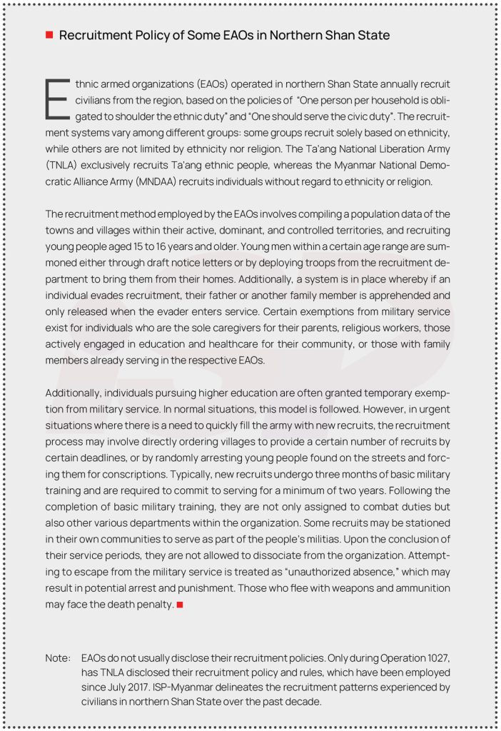 The fourth potential consequence is that recruitment will target primarily young people in rural areas, potentially affecting impoverished youth more severely. At the same time, it could also target Burmese and minority youths from areas with no significant insurgency groups and armed conflicts. Therefore, coercing these young people into military training and deploying them to the battlefield risks exacerbating societal divisions and animosities based on class, race, religion, and region throughout the country. Here, it is worth considering the enlistment of new recruits by certain ethnic armed groups in northern Shan State in addition to the recruitment efforts by the SAC. The Arakan Army (AA) and Ta’ang National Liberation Army (TNLA) principally recruit based on ethnicity, whereas the Myanmar National Democratic Alliance Army (MNDAA) recruits individuals from its territory without regard to ethnicity or religion. A system is in place whereby the father or another family member of an individual evading recruitment is apprehended. Those who desert the military can face re-arrest and punishment while fleeing with weapons and ammunition could lead to the possibility of the death penalty. The Shan State Progress Party (SSPP) conveyed a message through social media in Shan language (an ethnic language) that safeguarding a territory requires adequate military strength, urging locals to enlist in their army.