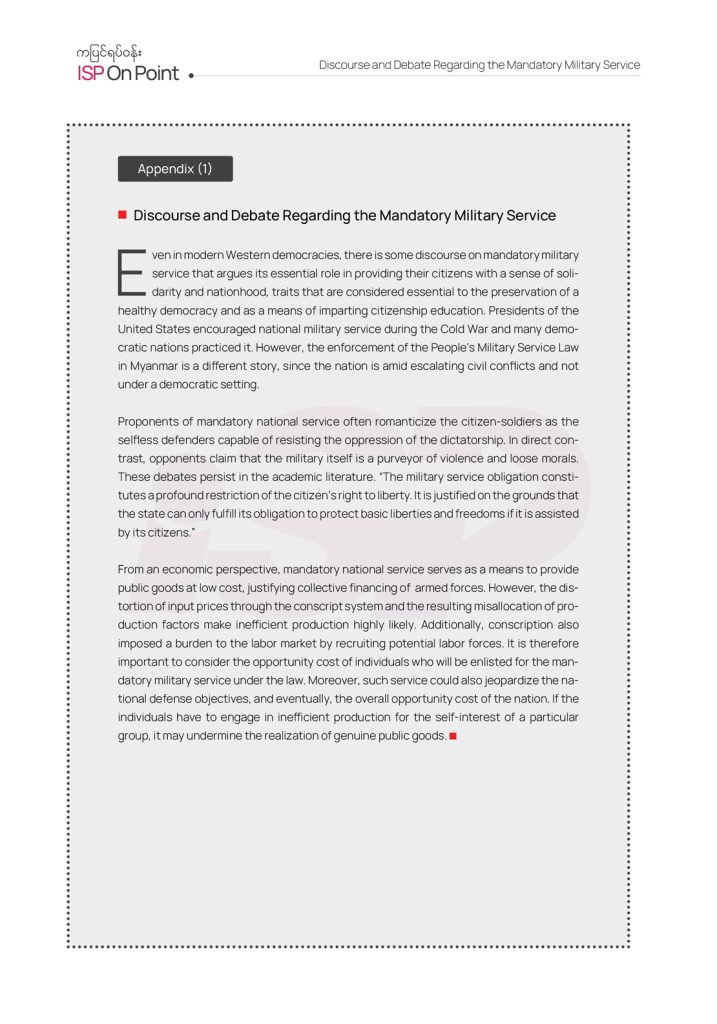 Last year marked the 75th anniversary of independence, similarly, civil war also turned 75 years. However, this year has again witnessed an escalation in conflict. The implementation of the People’s Military Service Law at this juncture could potentially catalyze an expansion and impacts of conflict within society. The fact that ethnic armed forces will be simultaneously compelled to recruit and bolster their military capabilities is also significant. Without focusing on a comprehensive peace process while the military forces are expanding at an accelerated rate and subsequent expansion of conflict, Myanmar’s armed conflict level is unlikely to be reduced in the foreseeable future. Being forced to serve in the military for a set duration – typically at least two years – during one’s youth comes with an opportunity cost at an individual level as well as at the society level. When a nation collectively chooses the path of securitization and militarization, it inevitably incurs an opportunity cost in the development and productivity of the nation, impeding the country’s positive trajectory for generations to come.